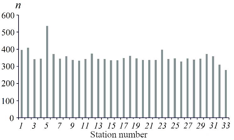 В среднем на каждой станции в 1991–2020 гг. было отобрано и проанализировано на содержание БВ 360 проб воды (рис. 3). Выполнено по 90 анализов каждого ингредиента, т. е. по 45 проб из поверхностного и придонного слоев воды. Этого достаточно для объективной статистической оценки [18].