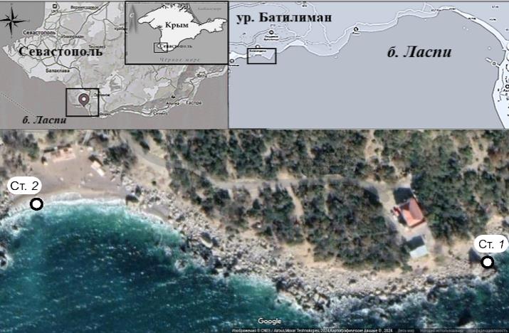 Рис. 1. Карта-схема отбора проб морской воды и макрообрастаний в акватории урочища Батилиман, 2023 г. Снимок Google Maps (URL: https://www.google.ru/maps)