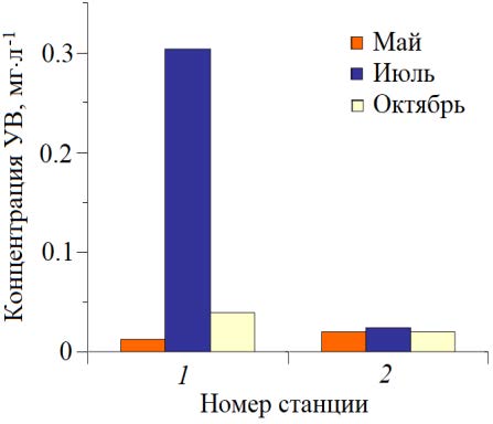 Общее содержание УВ в воде на исследуемых станциях в период с мая по октябрь 2023 г. колебалось в пределах 0.013–0.304 мг∙л–1 (рис. 2). В июле на ст. 1 было зафиксировано превышение ПДК для рыбохозяйственных водоемов (0.05 мг/л) [4] в 6 раз (рис. 2), на ст. 2 в исследуемый период значение концентрации УВ было достаточно низким и ПДК не превышало.