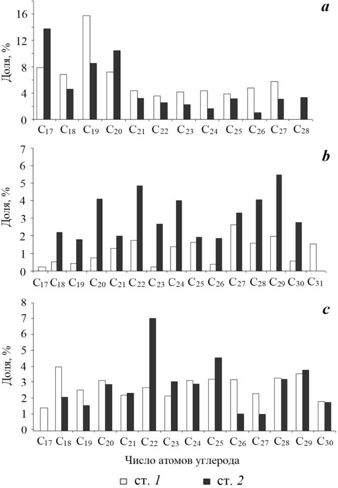 На ст. 1 гомолог н-С17 был идентифицирован в малых количествах, а на ст. 2 не обнаружен вовсе (рис. 3, b). Индекс TAR на обеих станциях значительно превышал единицу (табл. 2), что свидетельствует о преобладании аллохтонного вещества, поступающего с суши.
