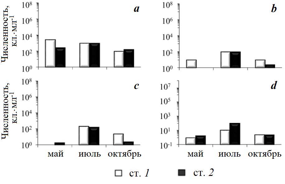 ФОБ на ст. 1 выявлены во всех пробах (рис. 4, d). Максимум (10 кл.мл–1) обнаружен на ст. 1 в июле, в остальных пробах ст. 1 данная группа бактерий представлена единичными клетками в миллилитре морской воды. На ст. 2 ФОБ также обнаружены во всех пробах (рис. 4, d). Максимум (95 кл.мл–1) выявлен на ст. 2 в июле. В остальных пробах численность ФОБ не превышала 10 кл.мл–1.