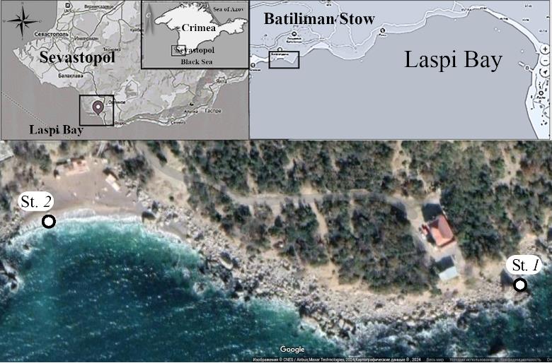 This area is highly appealing for tourists, but due to its small recreational capacity there is a danger of negative impact of mass unregulated visitation on the state of the water area ecosystem. Over the last decades, the ecological state of the concerned water area has deteriorated. This is due to the increase in the flow of visitors and development of the coastal zone, as well as the placement of mussel farms nearby (with an output of up to 83 t (per dry weight) of biosediments per year, including 3 t of protein and 1 t each of carbohydrates and lipids [8]). Recent studies have shown that the number of polychaete species has decreased from 64 (1983) to 45 (2019) [9], the macrophytobenthos stock of the Black Sea environment-forming species have decreased by about 1.5 times, whereas some bottom areas have lost vegetation at all [10]. According to the authors of work [11], in 2017–2018, the content of petroleum hydrocarbons (PHC) in the water of Laspi Bay was close to the maximum permissible levels. At the same time, in the summer of 2018, the maximum permissible concentration (MPC) was exceeded 3–4 times. The PHC content in Laspi Bay was higher than their average content in Sevastopol bays, and in 2016 the frequency of recorded cases of exceeding MPC in the bottom horizon of the water area of Laspi Bay was 25% [12, 13]. Thus, the authors indicate that the study area, previously classified as reference clean, is under a significant anthropogenic impact. Probably, the obtained results are related to the recent active development of the coastline of Laspi Bay [11].