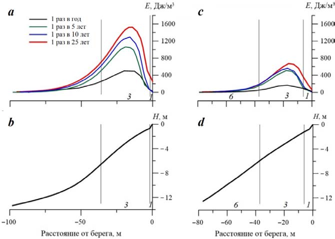 На разрезах III и IV (в восточной части бухты) (рис. 9) энергетическая нагрузка незначительная вблизи берега, затем она возрастает до максимальной на интервале глубин 2–6 м, где также расположен довольно крутой подводный склон с доминированием цистозиры (цифра 3 на рис. 9). На разрезе III в случае штормов, возможных 1 раз в год, максимальная энергетическая нагрузка составляет ~ 500 Дж/м3; при штормах, возможных 1 раз в 5, 10, 25 лет она достигает 1100, 1300, 1600 Дж/м3 соответственно. В области разреза IV волновая нагрузка значительно уменьшается, при этом в случае шторма, возможного 1 раз в год, она составляет 150 Дж/м3, 1 раз в 5, 10, 25 лет – 500, 550, 700 Дж/м3 соответственно.