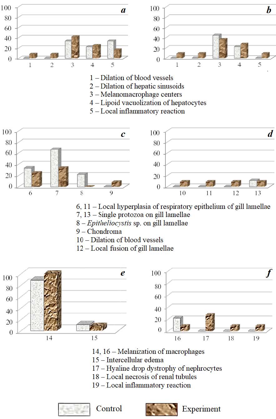 3. Рис. 2. Встречаемость (%) гистопатологических изменений в печени (a, b), жабрах (c, d) и почках (e, f) у султанки M. ponticus (слева) и морского ерша S. porcus (справа) в условиях воздействия ультразвуком
