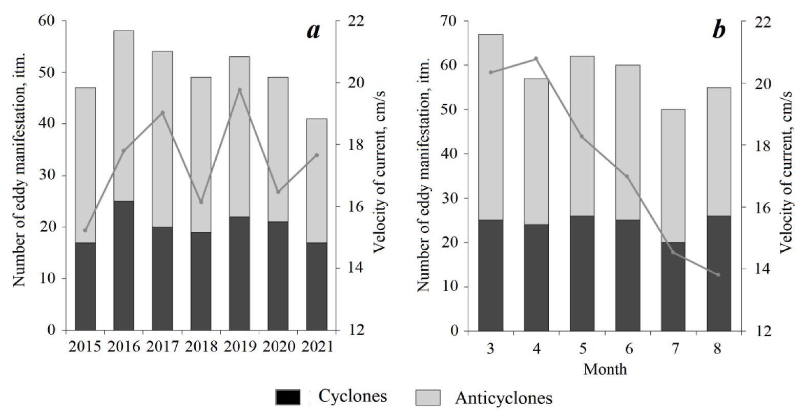 Fig. 3. Distribution of the number of mesoscale eddies and average velocity of currents (gray line) in the upper layer based on CMEMS reanalysis data by years (a) and months (b)