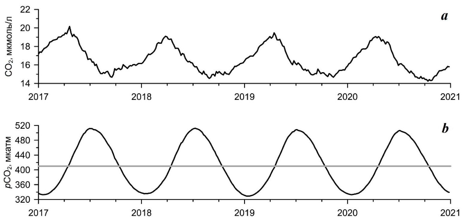 The maxima and minima on the graph of temporal variability of carbon dioxide concentration in the Black Sea surface layer do not coincide with the corresponding extremes on the graph of pressure. They are shifted by about three months. This is stipulated by the fact that the Henry constant, which relates the values of CO2 concentration in the sea and its equilibrium partial pressure, depends, among other things, on the sea water temperature, which varies considerably during the year.