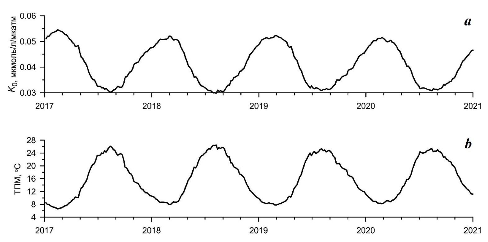 Figure 2, а shows the graph of the time dependence of the sea area averaged value of the Henry coefficient. The temperature and salinity fields obtained from the reanalysis of the Black Sea hydrodynamic fields were used to calculate the value of the coefficient at each grid point. The variability of the Henry coefficient is also highly seasonal and is almost antiphased to the change in the carbon dioxide partial pressure (see Fig. 1, b). Over the course of a year, the area average of the Henry coefficient changes by almost a factor of two. Figure 2, b shows the graph of sea surface temperature evolution. These two graphs change in antiphase and it can be concluded that the variation of the sea area averaged value of the Henry coefficient is determined mainly by the sea water temperature. That is, the main contribution to the intra-annual variability of the CO2 partial pressure in the sea surface layer is made by hydrological factors (mainly water temperature). The partial pressure decreases as the water temperature decreases and increases as the temperature increases. Accordingly, as long as the dissolved CO2 pressure is greater than the atmospheric one, the flux through the sea surface is directed towards the atmosphere which is accompanied by a decrease in the dissolved CO2 concentration. Then, when the dissolved gas pressure becomes less than the atmospheric one, the flux through the surface changes direction with an increase in the dissolved carbon dioxide concentration.