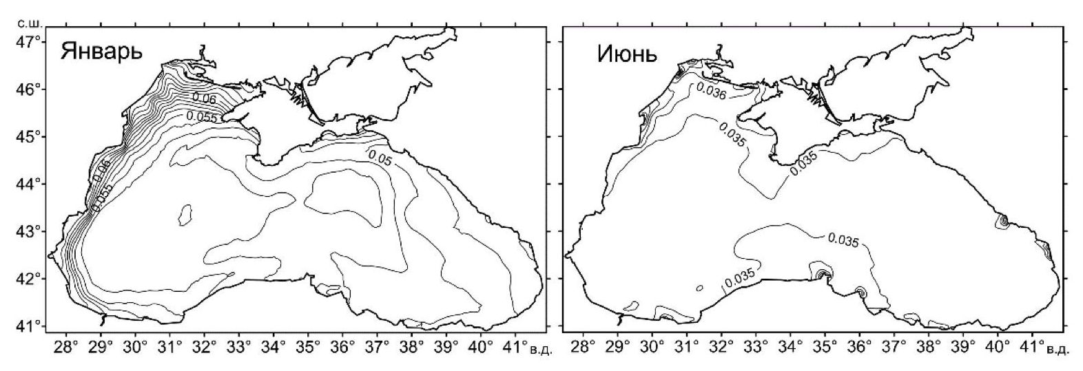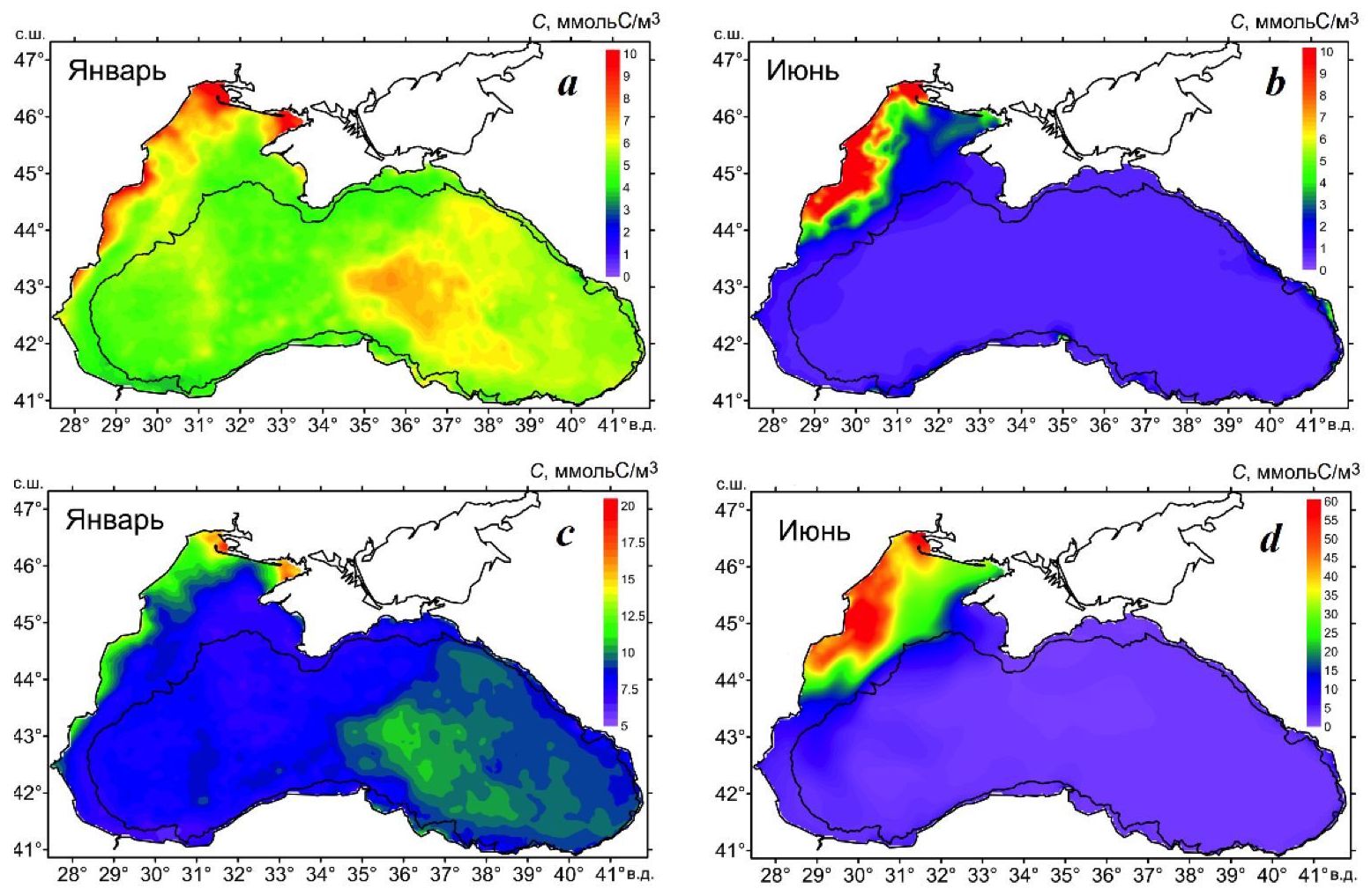 In January, the surface phytoplankton concentration is relatively high throughout the Black Sea area (Fig. 5, a), including its deep water. Total plankton concentration also shows high values (Fig. 5, c), but mainly due to phytoplankton. Accordingly, the absorption of carbon dioxide in the process of photosynthesis predominates in Fig. 5, c.