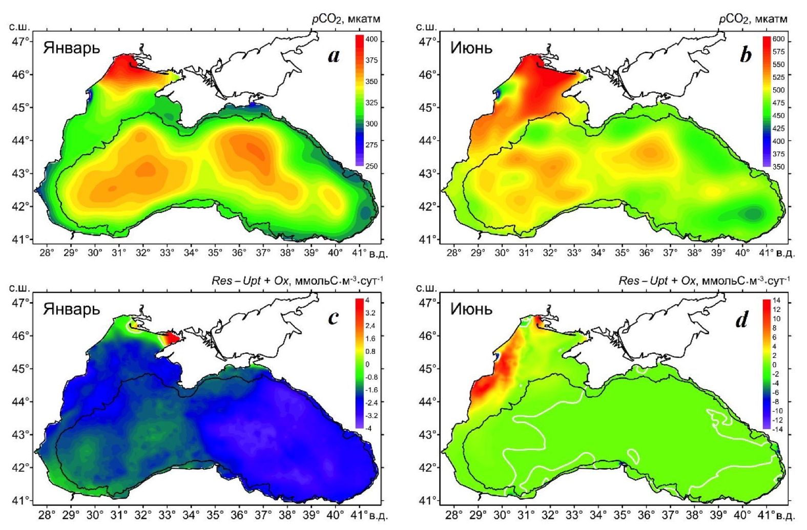 Fig. 4. Spatial distribution of partial pressure of carbon dioxide in the surface layer of the Black Sea (a, b) and monthly average maps of the surface distribution of the r = rеs – upt + Ox value (c, d) for January and June 2017 (the white line in Fig. 4, d indicates the zero isoline)
