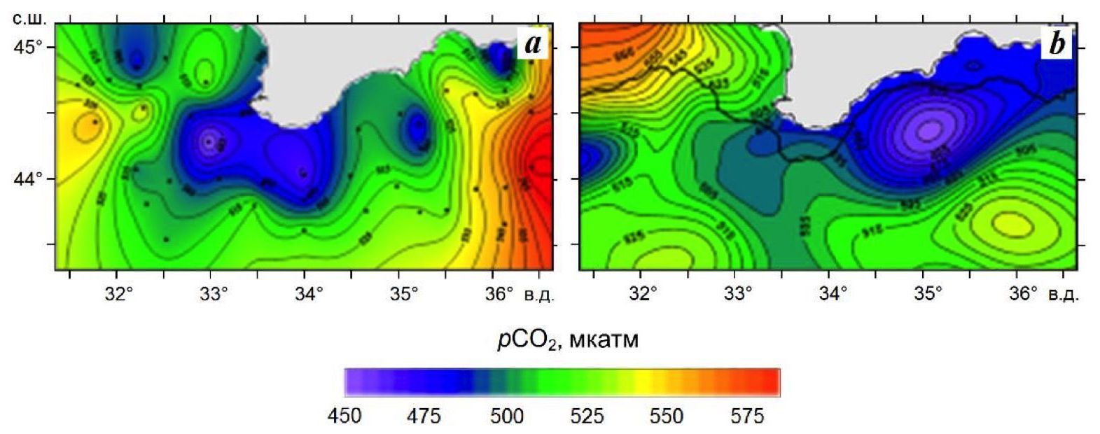 In general, the values of the CO2 equilibrium partial pressure near the sea surface obtained from the simulation results are quite close to the measurement data. The spatial distribution of pressure on two maps does not coincide, however, a characteristic decrease of pressure values near the Southern Coast of Crimea and Sevastopol is observed on both maps. It should also be noted that the map obtained from the model refers to a specific date (26 June), while the survey, on the results of which the left map is based (Fig. 6, a), lasted more than two weeks.