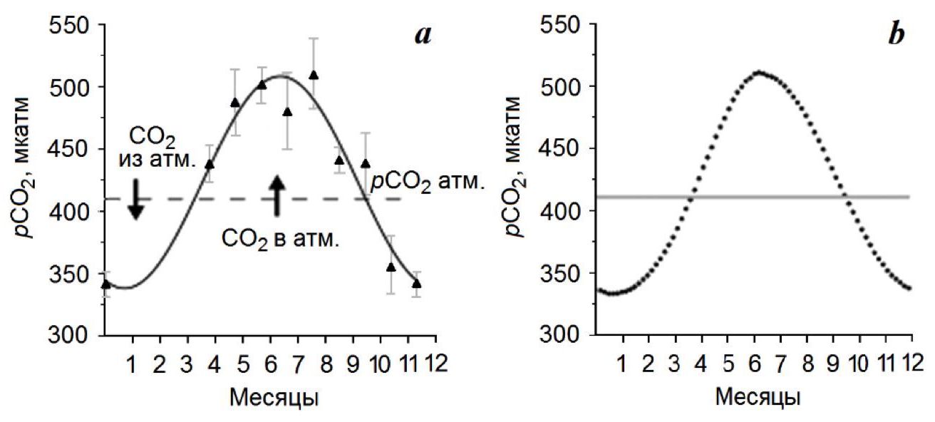 Figure 7 shows graphs of intra-annual variability of the Black Sea water area average values of equilibrium partial pressure of carbon dioxide pCO2 obtained from measurements and simulation results averaged over four years. The left graph (Fig. 7, a) was kindly provided by the Marine Biogeochemistry Department of Marine Hydrophysical Institute. It is based on the processing of data obtained in 2015–2021 during the R/V Professor Vodyanitsky expedition studies of Marine Hydrophysical Institute. The location of stations is given in [7, p. 871].