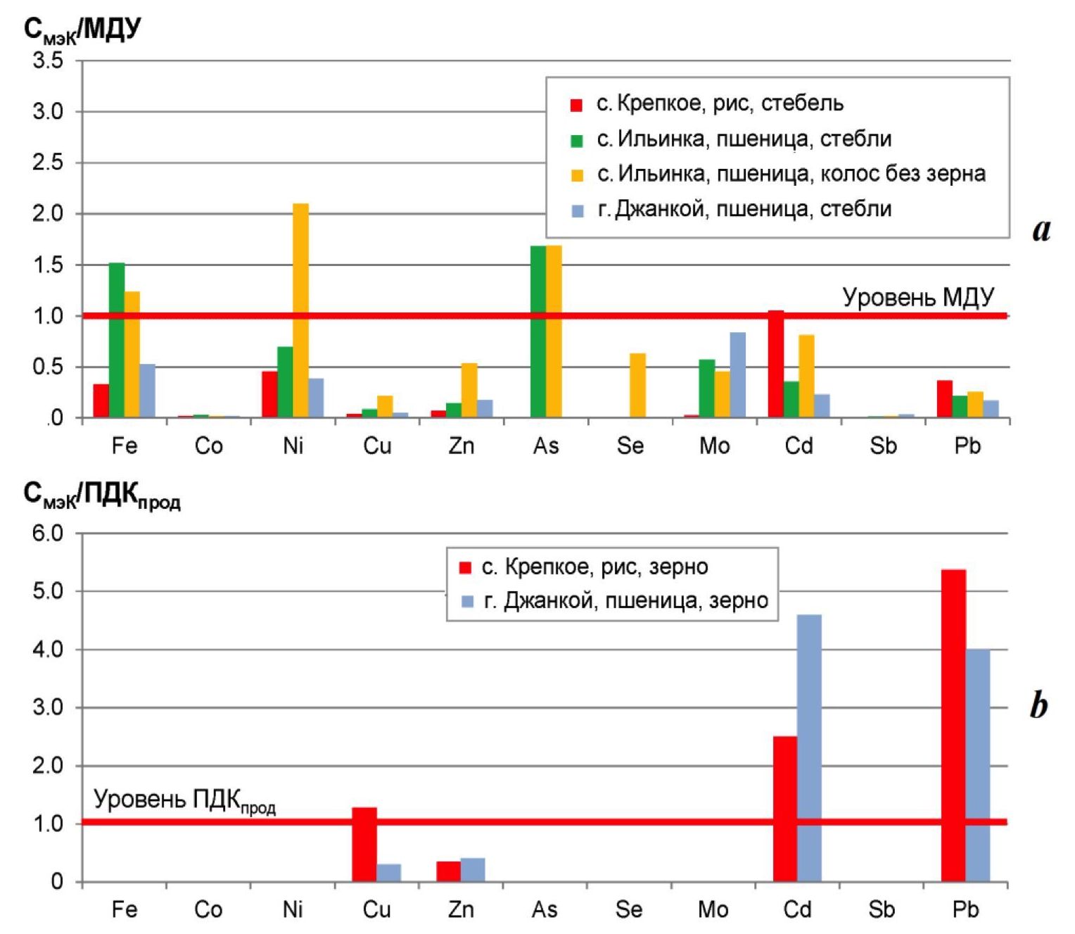 Fig. 7. Ratio of trace elements concentrations in rice and wheat crops to МДУ (maximum permissible levels for grain and grain fodder for livestock feed) (a) and ПДКпрод (MPC for grains and cereals as human food products) (b)