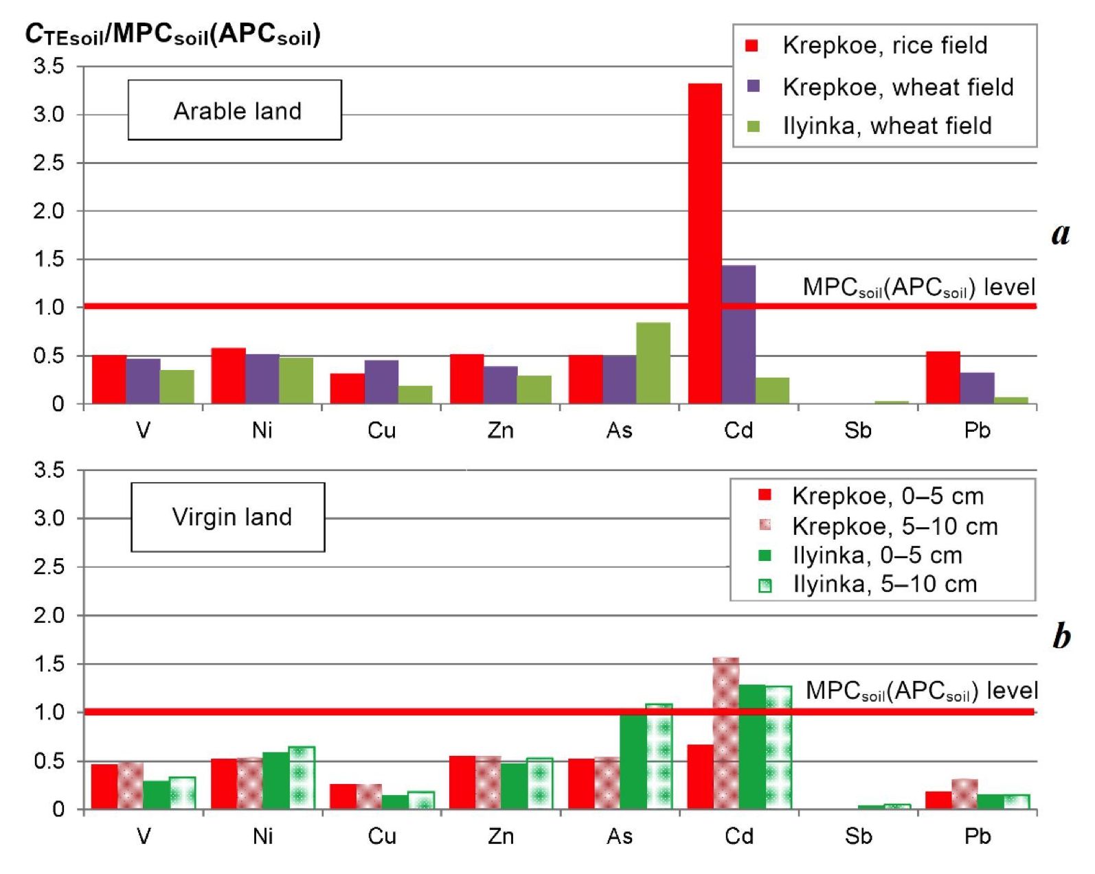 Наблюдалось систематическое превышение ПДКп Cd – до 230 % – на рисовых и пшеничных полях (с. Крепкое, рис. 1, табл. 1), а также в целинных почвах (с. Крепкое, c. Ильинка, рис. 1, табл. 1). Вертикальное распределение Cd в пахотных землях свидетельствовало о повышении его концентрации с глубиной слоя залегания. Максимальное превышение ПДКп Cd на рисовом поле в этом районе, по всей видимости, было обусловлено гомогенизацией поверхностных слоев почвы при механической обработке. Незначительное превышение ПДКп As наблюдалось только в целинной почве, прилегающей к рисовому полю у с. Ильинки (рис. 1, табл. 1), при этом в самой пахотной почве превышения не наблюдалось.