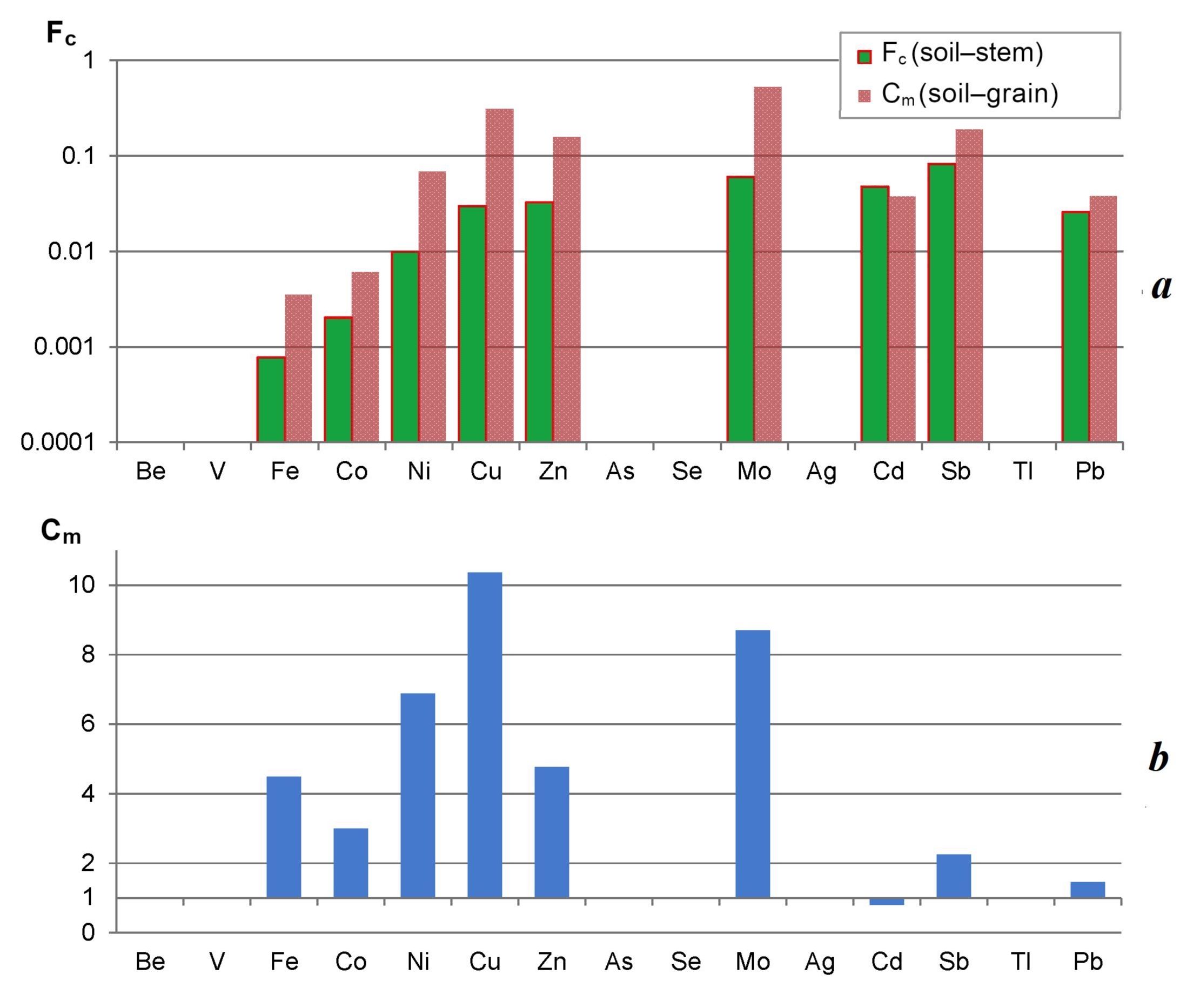 Показано (рис. 5, 6), что из достоверно определявшихся в культуре риса микроэлементов (Fe, Ni, Co, Cu, Zn, Mo, Sb, Cd и Pb) все элементы, кроме Cd, в зерне накапливаются более интенсивно, чем в стеблях. Для пшеницы определялось иное: в зерне Cd накапливался более интенсивно, чем все остальные определяемые элементы, а Sb и Mo в большей степени концентрировались в стеблях растений. Такое различие указывает на особенности физиологии культур риса и пшеницы [10–12].