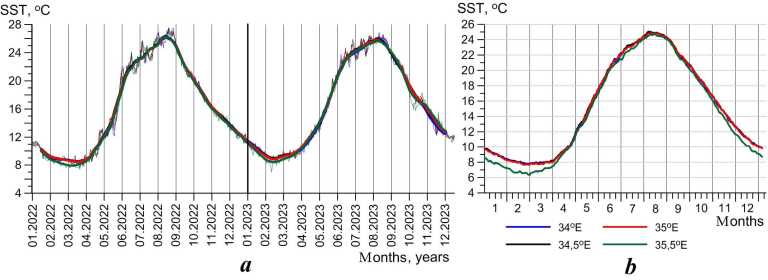 Fig. 6. Distribution of SST daily averaged values for the period from 1 January 2022 to 31 December 2023 (the heavy curves are smoothed by a 31-day moving average) (a) and its daily mean climate values from 1 January to 31 December (b) at different meridians at grid nodes located above the 50 m isobath, according to the satellite data