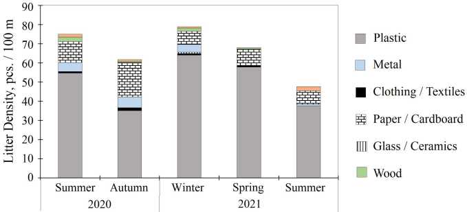 The highest litter concentrations were observed in the summer period of 2020 (245.2 pieces / 100 m) and in the winter period of 2021 (212.5 pieces / 100 m) (Fig. 2).