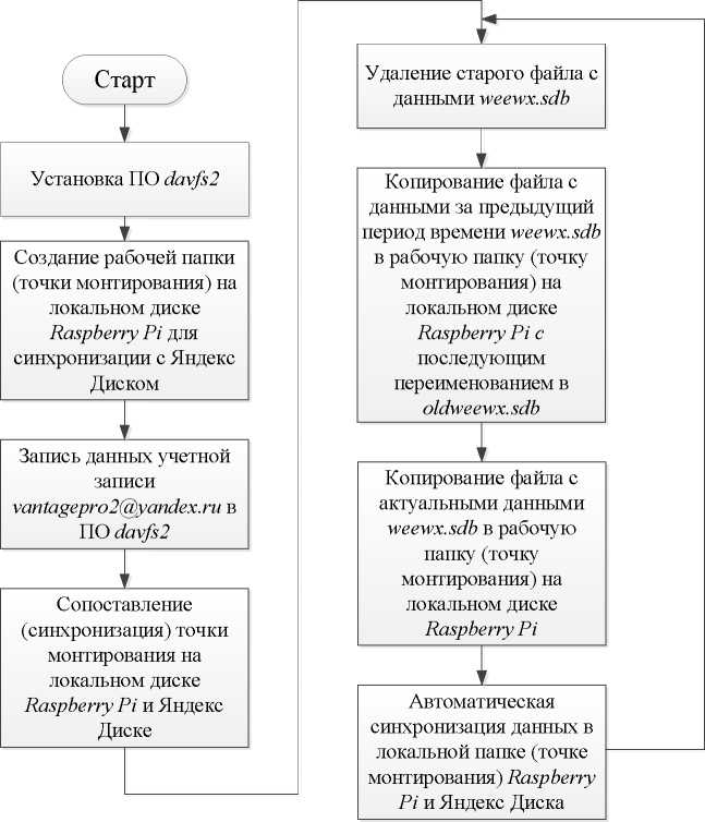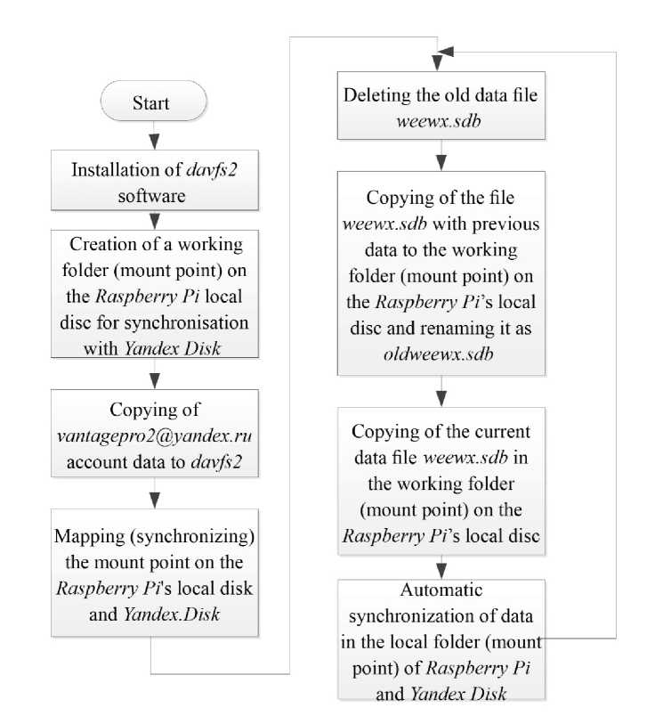 В результате указанных выше настроек были получены данные от встроенных датчиков метеостанции Davis Vantage Pro 2 (рис. 2). Результаты измерений метеостанции Davis Vantage Pro 2 в процессе работы непрерывно записываются ПО WeeWX в файл данных weewx.sdb, который хранится на локальном диске Raspberry Pi в папке /var/lib/weewx/weewx.sdb. Для обработки и анализа результатов измерений, а также их резервирования, целесообразно обеспечить копирование данного файла с Raspberry Pi на другой ПК или сетевое хранилище данных. Блок-схема алгоритма подключения и сохранения данных в сетевом хранилище приведена на рис. 3.