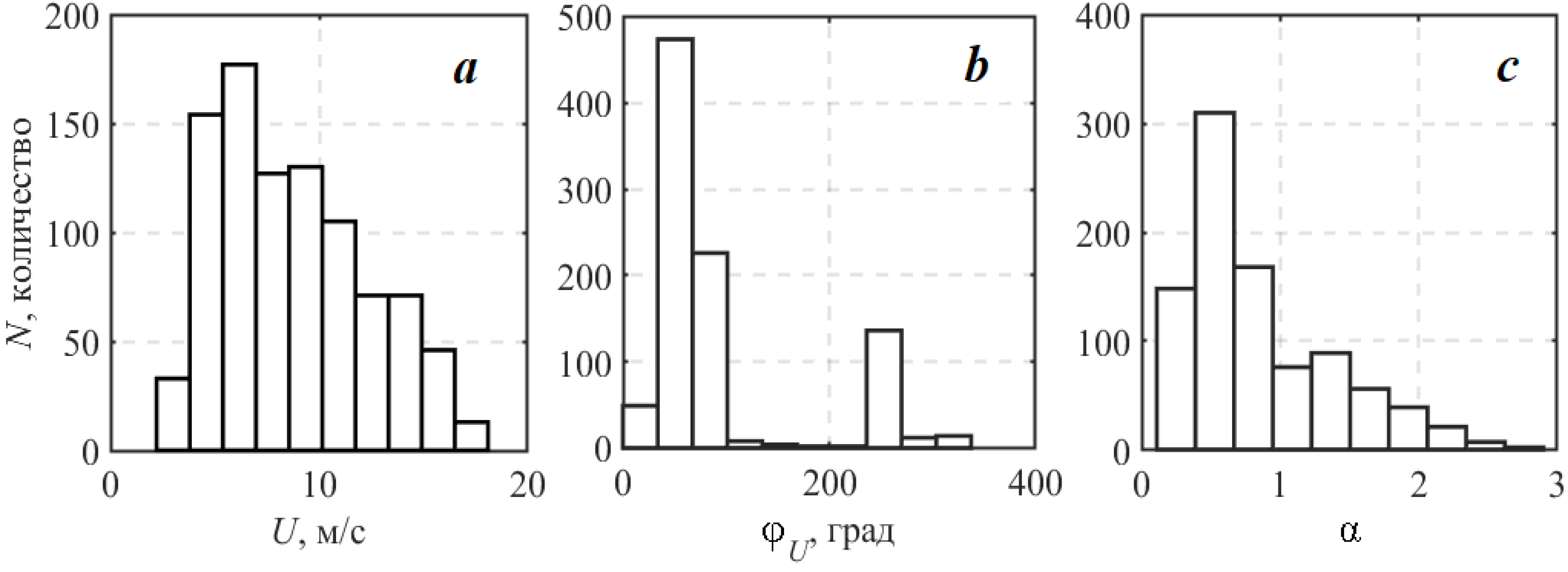 Fig. 2 demonstrates the histograms of values U, jU and a measured in the experiment. As can be seen from Fig. 2, a, wind speed ranged from 2 to 20 m/s, with the majority of observations being made in the U range of 5 to 15 m/s. During the experiments, winds were predominantly easterly (jU = 60–120°) and westerly (jU = 250°) (Fig. 2, b). The wave age distribution shown in Fig. 2, c shows that α varied from 0.1 to 3, with ~96 % of the wave age values ranging within 0.1–1.2.