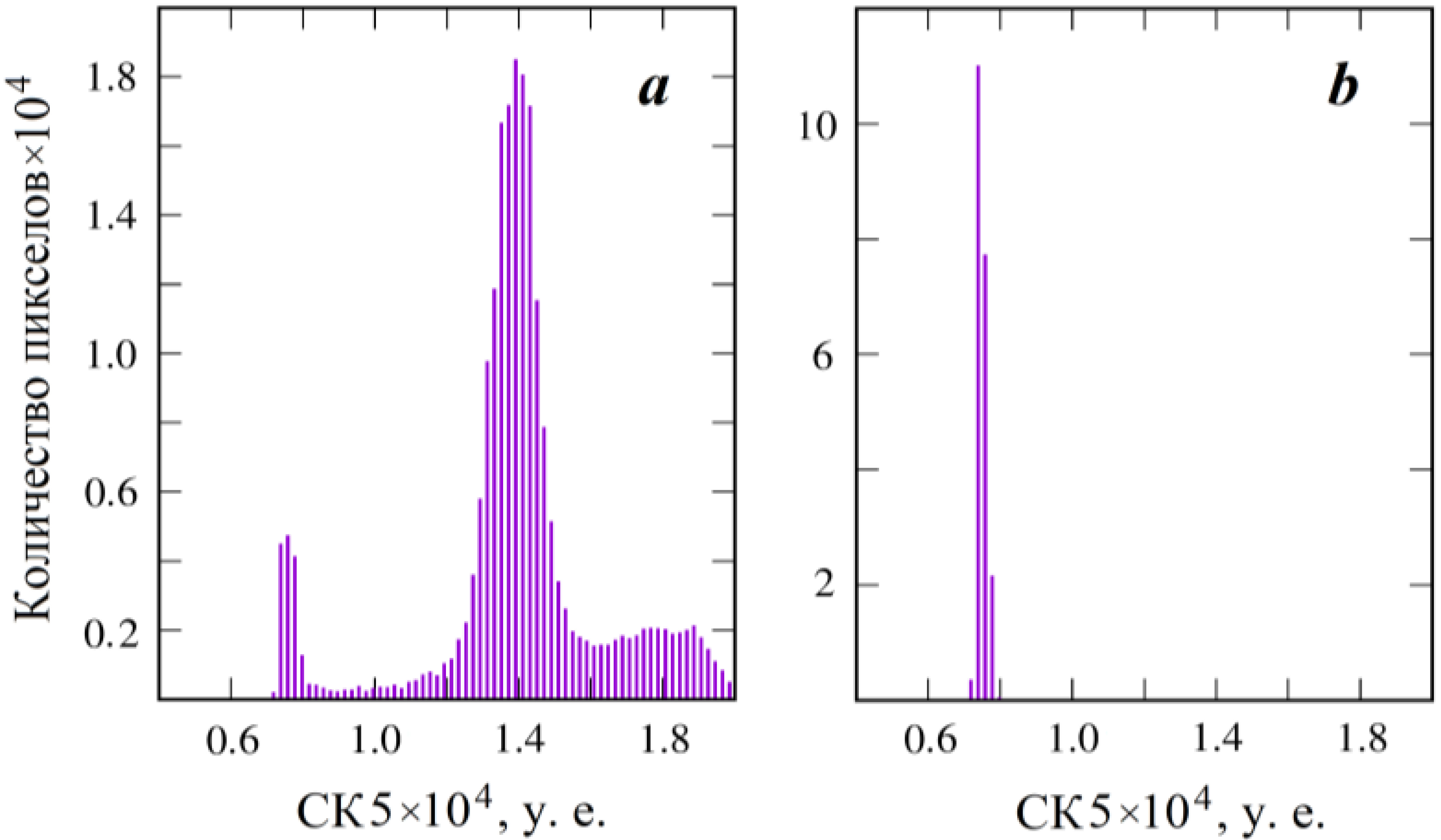 Для СК 5 для двух выбранных районов (рис. 2) были построены гистограммы (рис. 3). Контрольный район устьевого взморья (рис. 3, b) характеризуется диапазоном изменчивости сигнала, исходящего от водной поверхности, в интервале 7000–8000 у. е. В то же время весь возможный диапазон изменчивости для фиксированного участка дельты (рис. 3, a) составлял от 7000 до 26 000 у. е. На рис. 3 демонстрируется тот очевидный факт, что для ближнего инфракрасного диапазона сигнал от водной поверхности (рис. 2, b) существенно слабее, чем от суши (рис. 2, a).