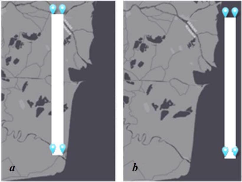 Рис. 2. Районы исследования: a – фиксированный участок дельты; b – контрольный район устьевого взморья (URL: https://earthexplorer.usgs.gov/)