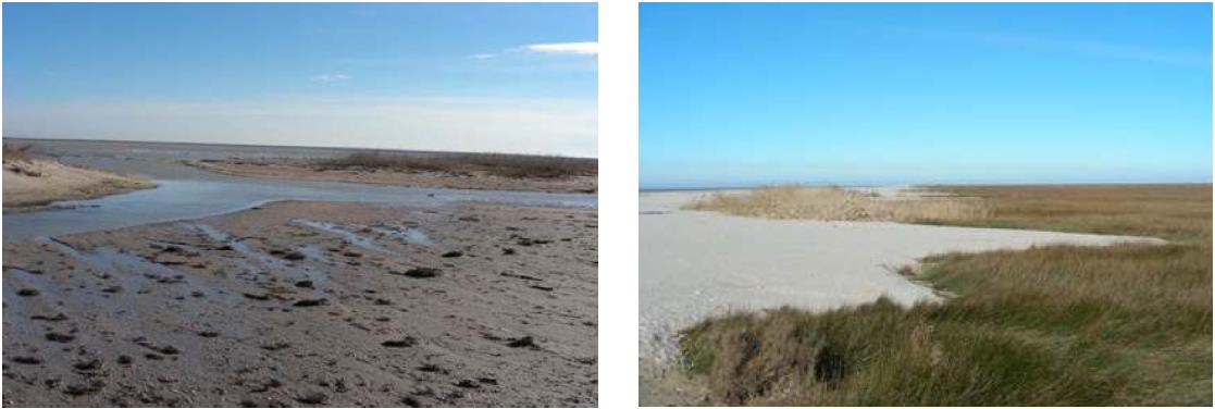 Fig. 6. Transformation of the western branch of the Bakalskaya Spit during the storm: left – a washout in the barrier beach of Bakalskoe Lake; right – movement of sand from the seashore to the inner part of the spit