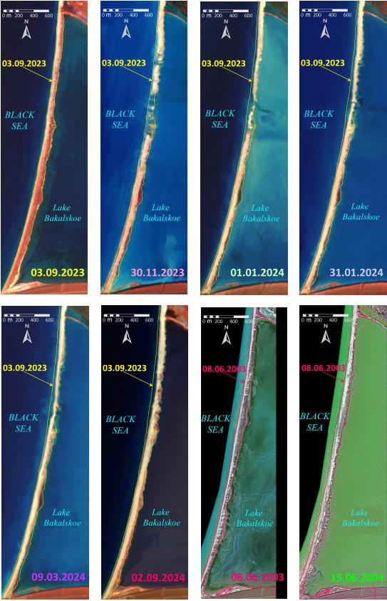 Fig. 9. Transformation of the barrier beach of Lake Bakalskoe after the storm on 26–27 November 2023. For comparison, illustrations of the transformation of the barrier beach in 2003–2004 are given