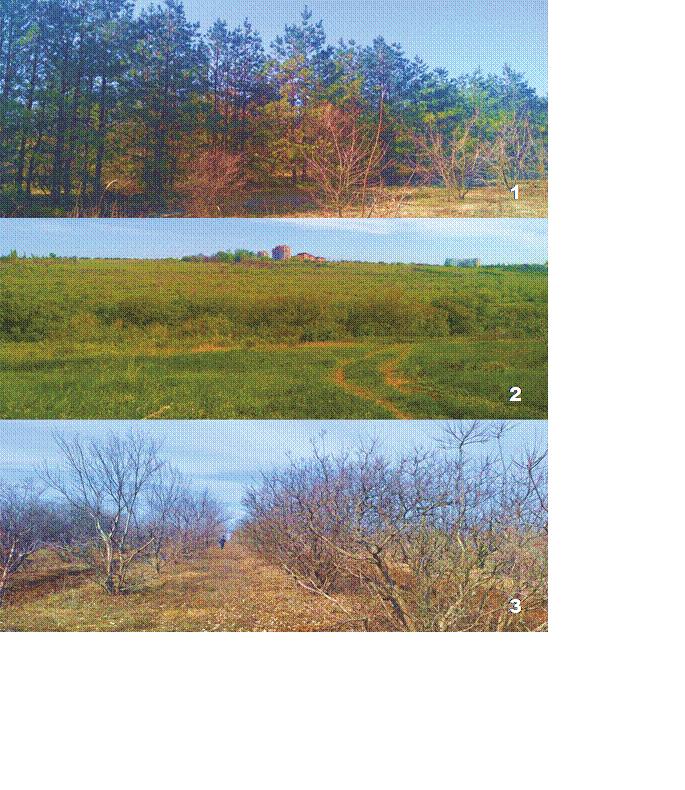 Рисунок 1. Общий вид опытных участков: 1 – Новоаннинское лесничество (Волгоградская область), дата снимка 12.04.2022 г. 2 – Кировский селекционно-семеноводческий комплекс, г. Волгоград, дата снимка 6.05.2023 г. 3 – Дендрарий Нижневолжской станции по селекции древесных пород, г. Камышин, дата снимка 15.04.2024 г.