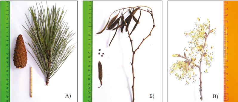 Рисунок 2. Репродуктивные показатели сосны крымской (А), робинии псевдоакации (Б) и вяза гладкого (В)