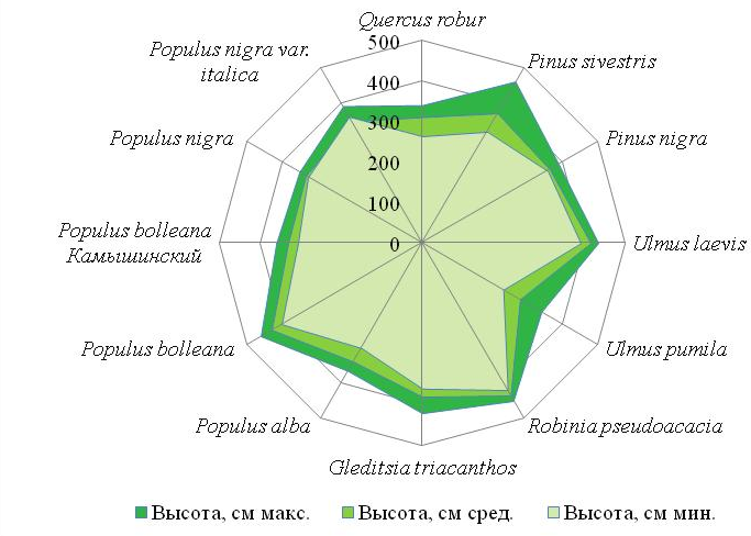 Рисунок 3. Показатели высоты у древесных пород Новоаннинского лесничества