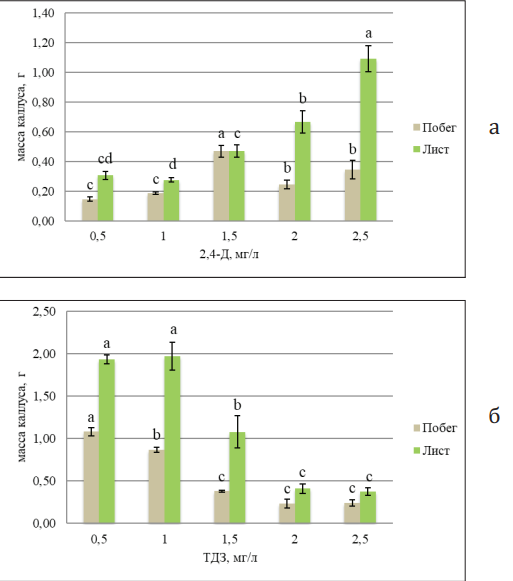 Было отмечено, что на нарастание массы первичного каллуса оказывают влияние тип экспланта и концентрация фитогормона. Максимальные показатели массы каллусных тканей фиксировались на листовых эксплантах при концентрации ТДЗ 0,5-1 мг/л (1,93 и 1,97 г соответственно) и 2,4-Д 2,5 мг/л (1,09 г). О том, что лист является наиболее подходящим эксплантом для получения каллусных культур у представителей рода Populus, подтверждается и результатами исследования С. Билоус, согласно которым, было установлено, что фрагменты листовой пластины Populus tremula характеризуются более активным каллусогенезом, чем побеги [1]. Также была установлена прямая и обратная зависимость между массой образовавшегося каллуса и концентрацией 2,4-Д (рис. 1 а) и ТДЗ (рис. 1 б) соответственно.