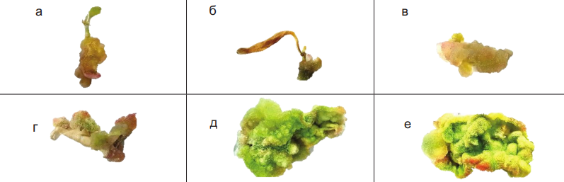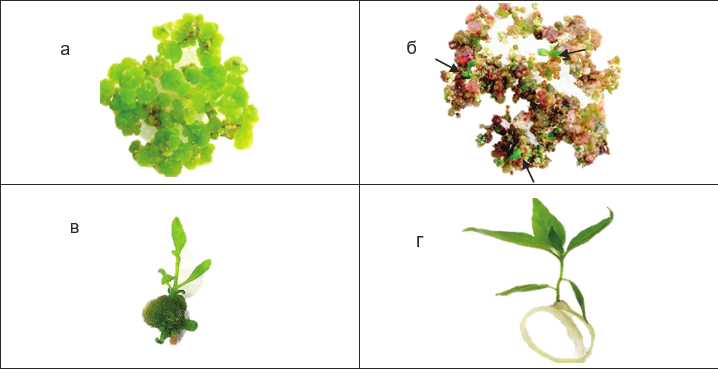 Разрастающийся каллус субкультивировали на свежую питательную среду каждые 3 недели. После 4 пассажа рост каллуса прекратился, и отмечались активные процессы непрямого морфогенеза из каллусных тканей (рис. 4 б). Формировавшиеся растения имели признаки обводненности листьев (рис. 4 в). Однако после их отделения от каллуса и переноса на питательную среду MS, по истечении 4 недель признаки витрификации исчезали, а у растений отмечался активный рост и хорошее укоренение (рис. 4 г).