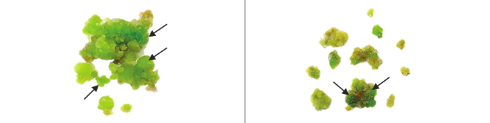 После переноса полученных трансплантов первичного компактного каллуса на питательную среду с ПЭГ 2 % отмечалась остановка роста каллусных тканей, а по истечении 14 дней культивирования, фиксировались четко оформленные морфогенные зоны (рис. 3). Полученные данные согласуются с результатами исследования Heringer с соавторами [11], которые сообщили, что добавление 10 % PEG-3350 в культуральную среду увеличивало количество и качество морфогенных каллусов у Carica papaya L.