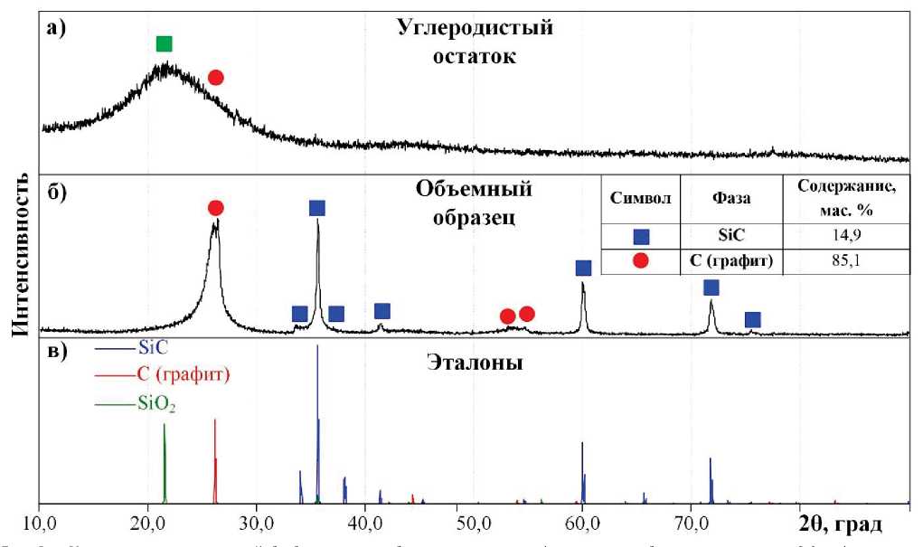 Как видно, введение дополнительного компонента (кварцевого песка) существенно влияет на конечный фазовый состав, что выражается в принципиально разном характере картин рентгеновской дифракции. При незначительной добавке кварца (рис. 4, а) наблюдается снижение относительной интенсивности графитовых максимумов (~ 26 град.) в сравнении с образцом из исходного УО (рис. 4, в) и возрастание максимумов, соответствующих фазе SiC. В конечном итоге это выражается в троекратном повышении количественного выхода SiC до 53,5 мас. % в составе объемного изделия.