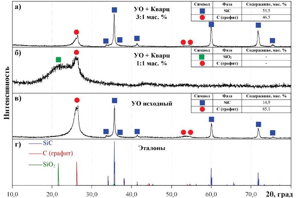 При идентичных условиях спекания (давлении, температуре, времени выдержки и скорости нагрева) методом SPS были получены объемные образцы из смесевых составов УО+кварц. На рис. 4 приведены рентгеновские дифрактограммы полученных материалов в сравнении с эталонными данными и образцом из измельченного углеродистого остатка. Также приведены данные количественного рентгенофазового анализа в виде таблиц.