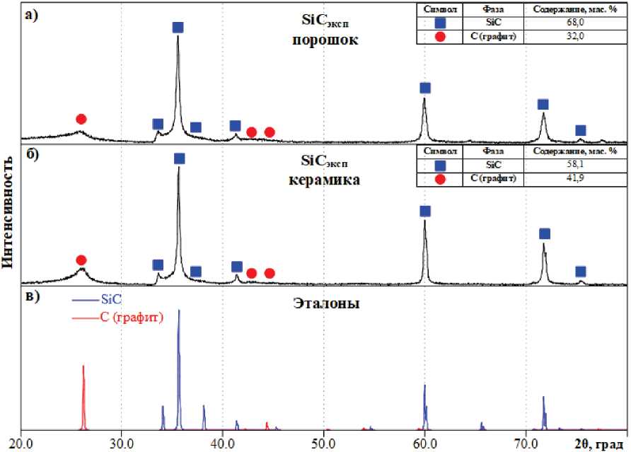 Реализация указанного способа синтеза карбида кремния позволила получить из исходного молотого углеродистого остатка порошок SiCэксп, фазовый состав которого также оценивался методом рентгеновской дифрактометрии. Результаты данного анализа приведены на рис. 5, а. Как видно из представленных данных, карбид кремния является доминирующим компонентом, о чем можно судить по соотношению максимумов SiC и С. Расчет фазового состава позволил установить, что содержание SiC в полученном продукте практически достигает 70 мас. %. Этот результат является весьма обнадеживающим с позиции возможной дальнейшей оптимизации процесса для повышения фазовой чистоты.