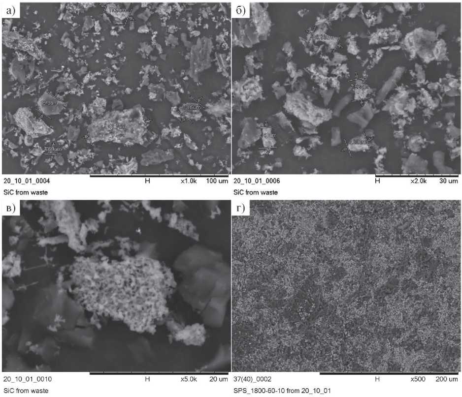 На рис. 6 приведены снимки растровой электронной микроскопии полученных дисперсных материалов (а–в) с проставленными размерами и микроснимок поверхности керамического образца (г). Как видно из приведенных изображений, дисперсный продукт характеризуется наличием двух основных типов частиц: более темных по контрасту – частиц углерода, и более светлых – частиц карбида кремния SiC. Возможность фазовой идентификации по контрасту обусловлена особенностями метода и разной плотностью исследуемых материалов. Материал с большей плотностью характеризуется более ярким свечением при взаимодействии с электронным пучком. Путем прямых измерений установлено, что частицы полученного SiC характеризуются размерами частиц от единиц микрометров до ~50 мкм. При этом наблюдается формирование агломератов, состоящих из более мелкой наноразмерной фракции, что отчетливо видно на рис. 6, в.