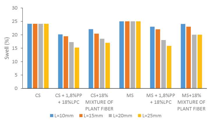 - Length effect: similar to PP fibers, increasing the length of plant fibers (L=25 mm) also contributed to a reduction in swelling as represented in Fig. 3. However, even with longer fibers, the reduction was still less pronounced than with PP fiber and cement.