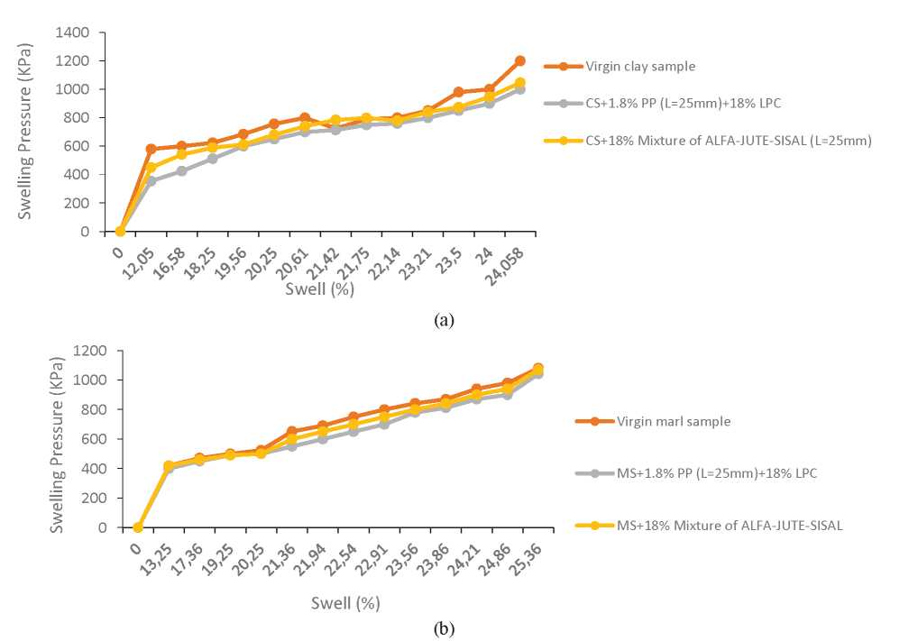 Moreover, the introduction of LPC into the soil composition yields noteworthy effects on swelling pressure. In reinforced marl soil, the swelling pressure surpasses that of clay soil, signifying the constructive influence of LPC in reducing swelling potential and enhancing soil integrity.