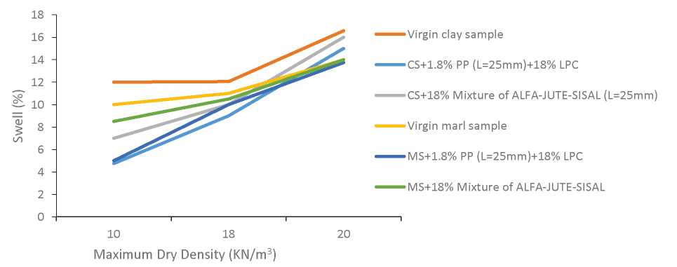 The evolution of soil swells as a function of dry maximum density can be described as a distinctive convex curve, mirroring the characteristic shape of the Proctor curve [46]. In our comprehensive study, we observed a compelling trend wherein the sample reinforced with PP fibers exhibited significantly greater stability when compared to the sample reinforced with natural plant fibers, which, in its turn, was more stable than the unaltered virgin soil sample. This progression is in accordance with logical expectations, as the introduction of reinforcing fibers, regardless of their origin, tends to fortify the structural integrity of the soil. Furthermore, the type of soil played a pivotal role in shaping these findings. Remarkably, the clay soil, despite its innate expansiveness, displayed notably more stable results compared to the marl soil as presented in Fig. 5. This intriguing outcome underscores the considerable potential of soil improvement techniques, such as fiber reinforcement, in not only mitigating the detrimental effects of soil expansion but also in enhancing overall soil stability and performance in diverse geological contexts.