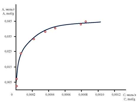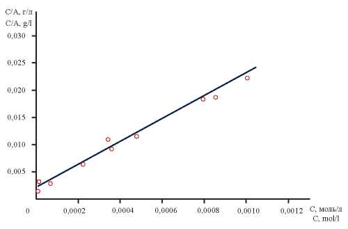 Последующая математическая обработка экспериментальных данных (рис. 2) методом наименьших квадратов показала, что в координатах С/A=f(С) изотерма сорбции описывается уравнением прямой (5) с высоким коэффициентом корреляции (R2=0,9520):