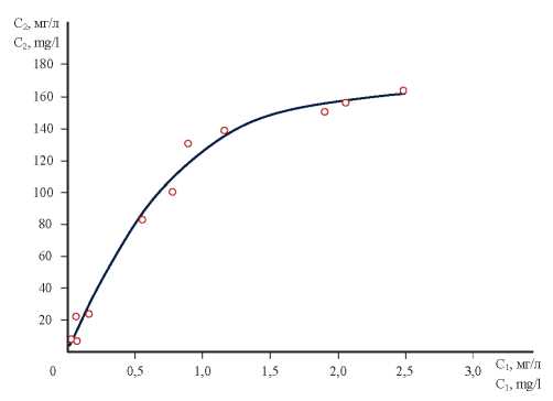 где С2 – количество соосажденного микрокомпонента; С1 – количество микрокомпонента, оставшееся в растворе; α и n – постоянные величины. Изотерма, описываемая по уравнению (10), на графике в координатах С2=f(С1) представляет характерную кривую линию (рис. 4).