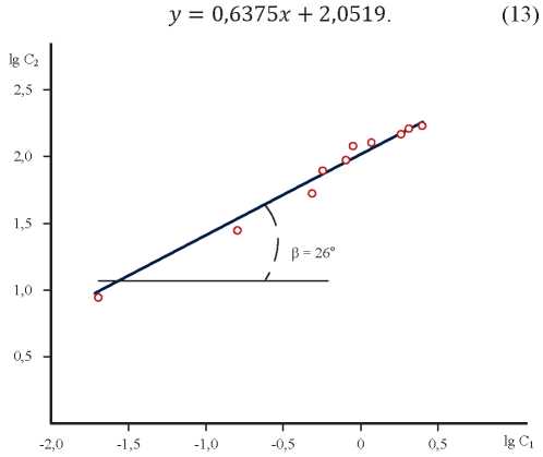 Из рис. 4 следует, что полученная изотерма представляет кривую линию, характерную для процесса адсорбционного осаждения. Последующая обработка экспериментальных данных по уравнению (10) и методике, представленной в [22], показала, что графически эта зависимость в логарифмических координатах lgС2=f(lgС1) (рис. 5) описывается уравнением прямой линии (13) с углом наклона 26° при величине достоверности аппроксимации R2=0,8803: