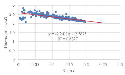 Рис. 1. Зависимость плотности абсолютно сухого образца от коэффициента пористости по керну. Данные по всем скважинам