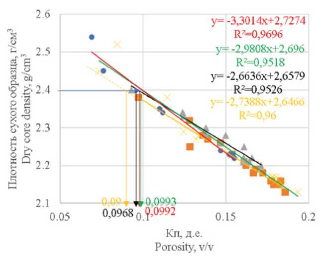 Рис. 2. Зависимость плотности абсолютно сухого образца от коэффициента пористости по керну. Данные по отдельным скважинам (каждый цвет соответствует одной скважине)
