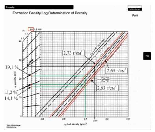 Рис. 3. Вычисление коэффициента пористости (палетка Por-5 Schlumberger)