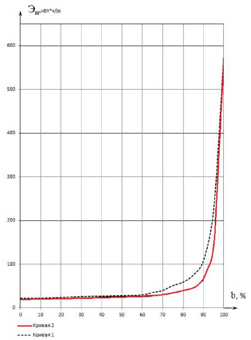 Рис. 1. Зависимость удельного расхода электрической энергии от величины обводненности пластовой жидкости при следующих условиях: кривая 1 – НД+НГЗУ=1000 м, кривая 2 – НД+НГЗУ=600 м