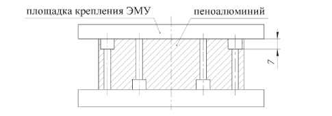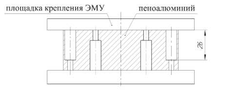 Макет твердотельного демпфера (рис. 2, а) содержит основание для крепления ЭМУ и основание для крепления твердотельного демпфера с установленным на нем ЭМУ на виброизмерительном стенде (рис. 2, б). Крепление пеноалюминия к посадочной площадке ЭМУ и основанию осуществляется таким образом, чтобы обеспечить кинематическую развязку между техническим устройством и плоскостью его установки через фрагмент демпфирующего элемента гасителя колебаний твердотельного демпфера. Причем в исследовательских целях применены два фрагмента с разной глубиной проточек для установки винтов 7 и 26 мм (табл. 1) для обеспечения различного сопротивления деформации материала пеноалюминия под воздействием вибрационных сил.