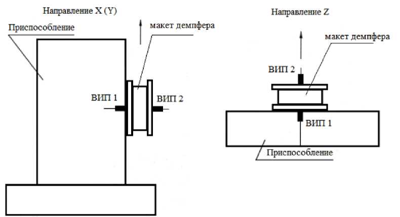 Определение АЧХ макетов осуществлялось поочередно в каждом из трех взаимно перпендикулярных направлениях (X, Y, Z) декартовой системы координат. Причем направления X и Y находятся в плоскости исследуемого объекта. ВИП устанавливались на макеты демпферов (рис. 3), рабочие оси которых ориентируются по направлению генерируемых стендом колебаний.