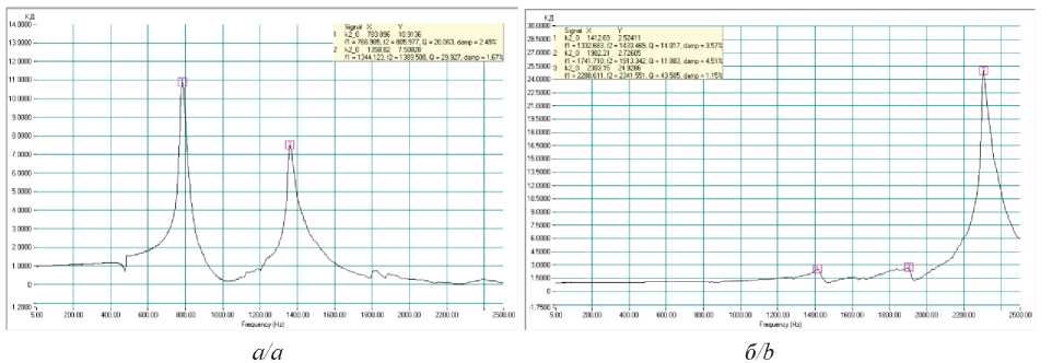 Рис. 4. АЧХ макета № 1 (а) по направлению X(Y), (б) по направлению Z