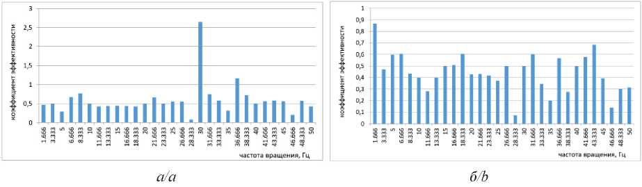 Рис. 6. Изменение коэффициента эффективности от частоты вращения ротора ЭМУ с макетом № 1 (а) по направлению X (Y), (б) по направлению Z